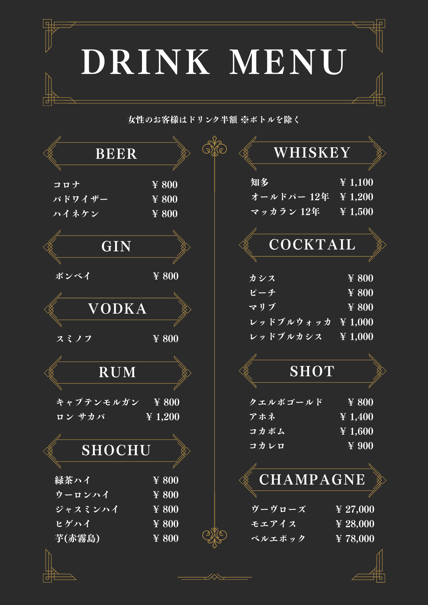 | エントランス料(ワンドリンク付)女性 | ¥500 |